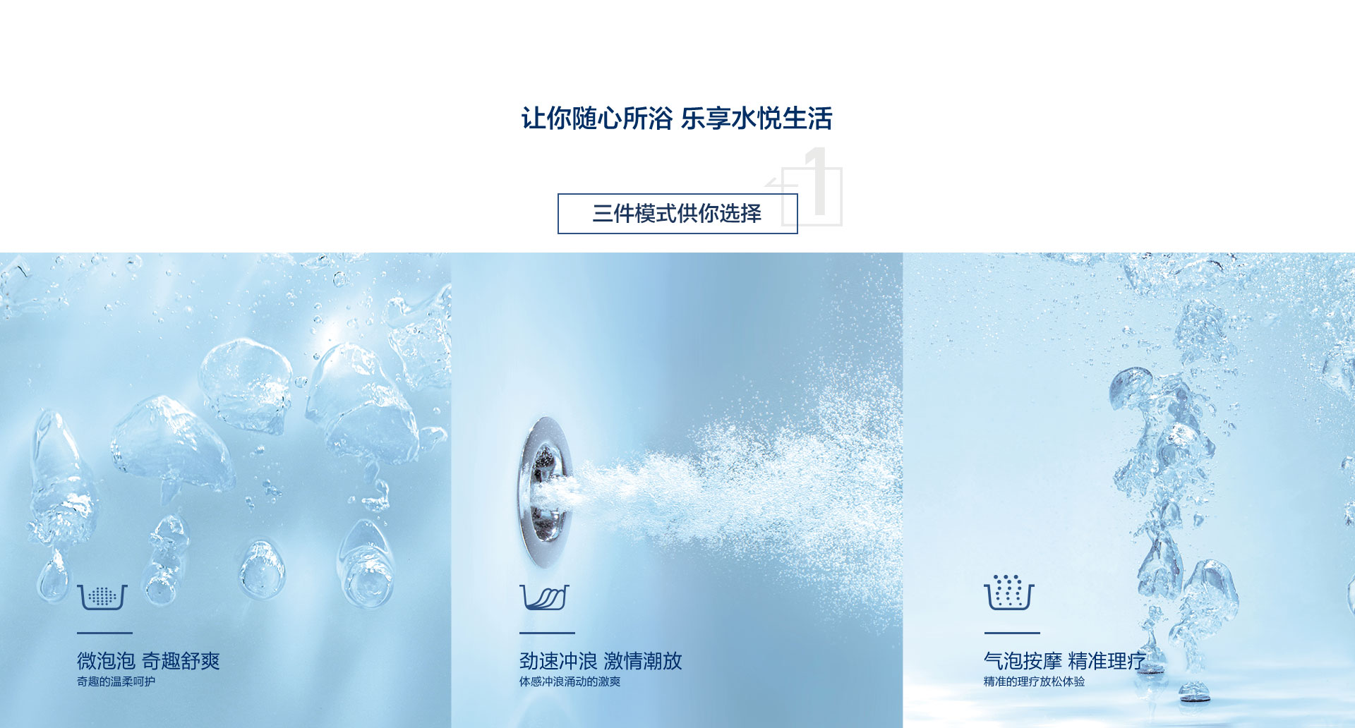 水療獨立按摩系統、勁速沖浪按摩系統、微泡泡按摩系統及汽泡按摩系統三件模式供你選擇,讓你隨心所浴,樂享水悅生活